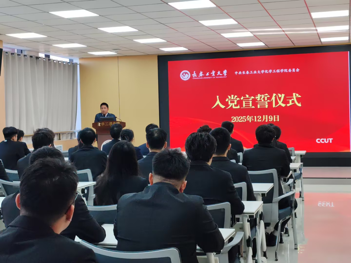 黄向东在讲话中对新发展的党员表示祝贺,他强调:入党宣誓是党员政治生命的成人礼,是信仰之路的新起点,更是践行初心使命的冲锋号。并向新发展的党员同志提出五点要求,一是牢记誓言、坚守信念,始终把对党忠诚作为根本遵循,筑牢信仰之基;二是加强学习、锤炼党性,持续深化党的创新理论学习,提升政治素养;三是担当实干、勇挑重担,将个人理想融入国家发展大局,在学术科研、社会实践中展现党员担当;四是争做表率、示范引领,发挥先锋模范作用,带动身边同学共同进步;五是严守规矩、端正作风,时刻绷紧纪律之弦,永葆共产党员的政治本色。